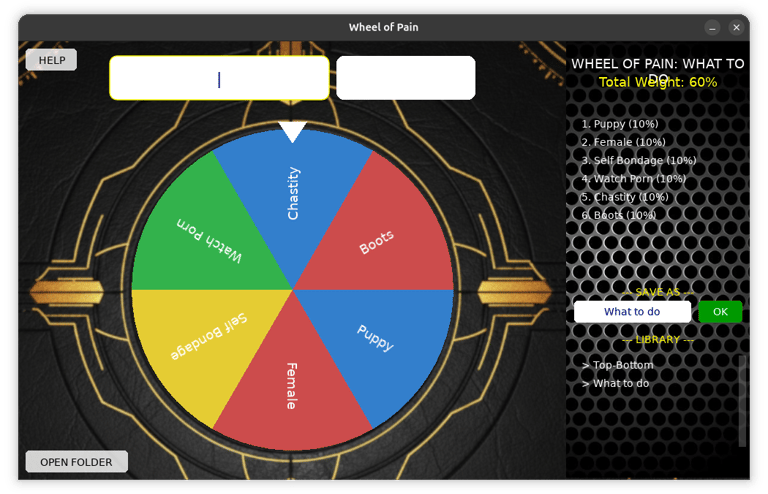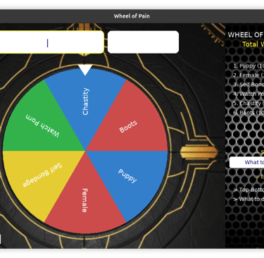 Let the wheel decide your fate. When you can't decide what to do, what to eat or how hard to spank the wheel is here for you. Let it decide if you will do self bondage today or be a puppy.It takes all the guessing away and frees your mind.
